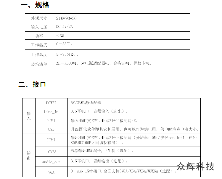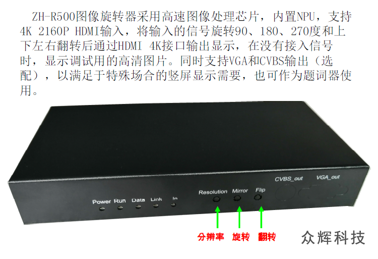 此款為ZH-R400的升級(jí)高端版本ZH-R500,此版本為全新發(fā)售,Linux嵌入式系統(tǒng),支持NPU,全按鍵操作,自動(dòng)記憶,自帶測(cè)試底圖,沒有信號(hào)接入時(shí)也可以調(diào)試,輸入輸出分辨率可以設(shè)置為1080P和2160P。支持上下左右鏡像,可做為題詞器使用。彌補(bǔ)之前版本分辨率低,顯示文字不清楚的問題,如果對(duì)顯示要求不高,價(jià)絡(luò)敏感的用戶也可以選擇ZH-R100 如果輸入不要求4K,可能選擇1080P輸入的ZH-R400,如果喜歡安卓系統(tǒng)可以選擇ZH-R300。
