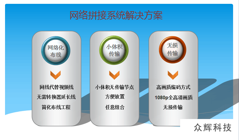 眾輝及時(shí)跟上當(dāng)今快速創(chuàng)新的步伐,進(jìn)行網(wǎng)絡(luò)產(chǎn)品設(shè)計(jì)和開(kāi)發(fā),把新的產(chǎn)品、新的技術(shù)應(yīng)用到安防監(jiān)控、視頻會(huì)議系統(tǒng)中,利用現(xiàn)有網(wǎng)絡(luò),成熟的網(wǎng)絡(luò)技術(shù)和拼接技術(shù),實(shí)現(xiàn)網(wǎng)絡(luò)拼接,這是對(duì)傳統(tǒng)的顛覆,拼接的一次革命。